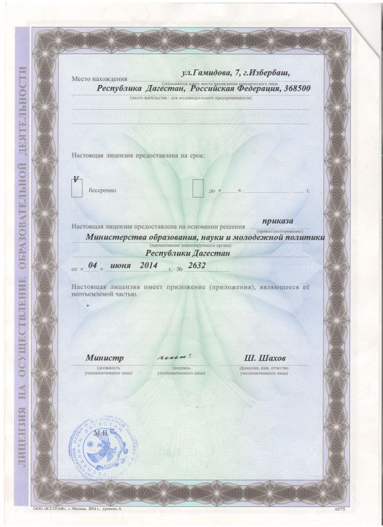 368502, Республика Дагестан, г.Избербаш, ул.Гамидова 7.
